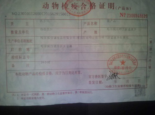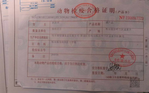按照以往每天进货流程,生产厂家都会向沃尔玛收货方提供当地动物卫生监督管理局(动监局)提供的检疫票,如果没有检疫票,沃尔玛可以拒绝收货。根据森顺恒发向记者提供的检疫票,每天哈信诚向沃尔玛供货300千克猪产品。