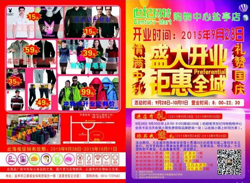 世纪玛特购物中心盐亭店筹备中,将于9月28日盛大开业!情满中秋,礼献国庆!世纪玛特购物中心盐亭店邀请您中秋来盐亭梓江新城金和商贸城负一楼来购物,优惠多多,惊喜多多,等您来哦!