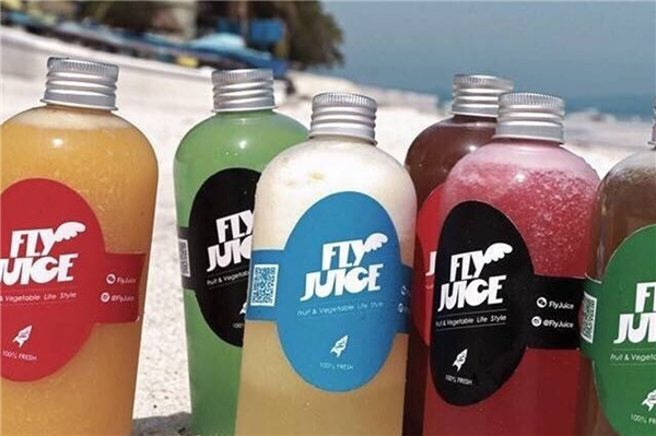 有的餐饮品牌追求国际化表述,这一点在上海特别明显。比如潮流文化创意人颜程Run和朋友创立的潮流饮品,品牌名叫FlyJuice (中文名福来聚斯)。