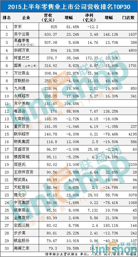 1、营收方面:总体来看,前30家上市公司销售增幅突出,同比5286亿增加19.7%;电商品牌是增长的蓝筹区,京东同比营收净增319亿,苏宁云商净增119亿,苏宁易购和唯品会分别增长93亿和83亿,四家净增值贡献超过58%;其中8家公司营收下跌,占比26.7%,多个以百货为主业的品牌营收下滑,为重灾区。