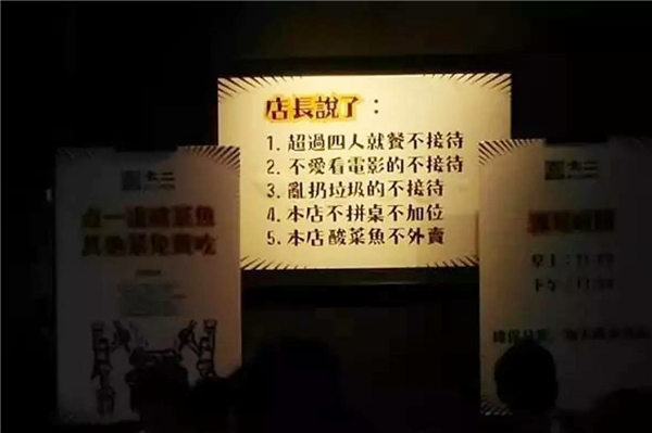 走进店内,便可看到墙上挂着一个大牌匾,上面写着“本店五不接待”,即:① 吃饭只顾着玩手机的;② 同行超过四个人进店的;③ 说我们家鱼不好吃的;④ 微信红包只抢不发的;⑤ 脾气比店长还要拽的。此五类客人,通通不接待。