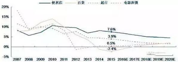 2016-2020年中国百货、超市、电器连锁和便利店业态销售额及增速预测: